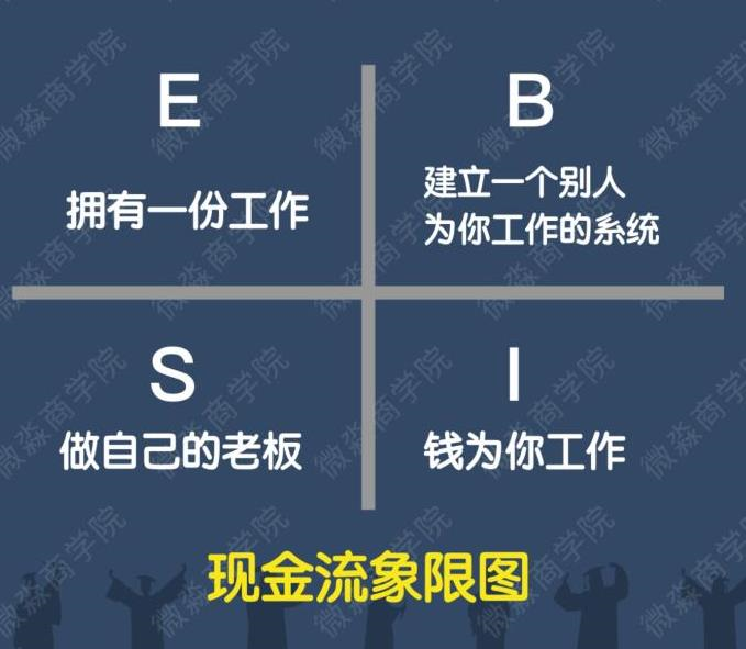 E拥有一份工作、B建立一个别人为你工作的系统、S做自己的老板、I钱为你工作,这四个现金流象限图,我们要努力做到B建立一个别人为你工作的系统与I钱为你工作,这两个现金流象限。