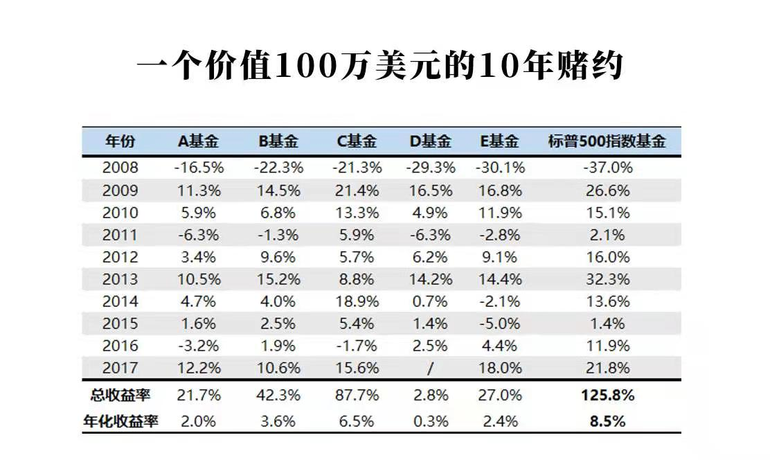 “标普 500 绝对会打败所有的主动基金,被动投资总体上一定会打败主动投资,因为主动投资的费用太高了。”