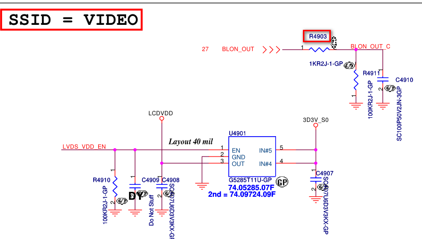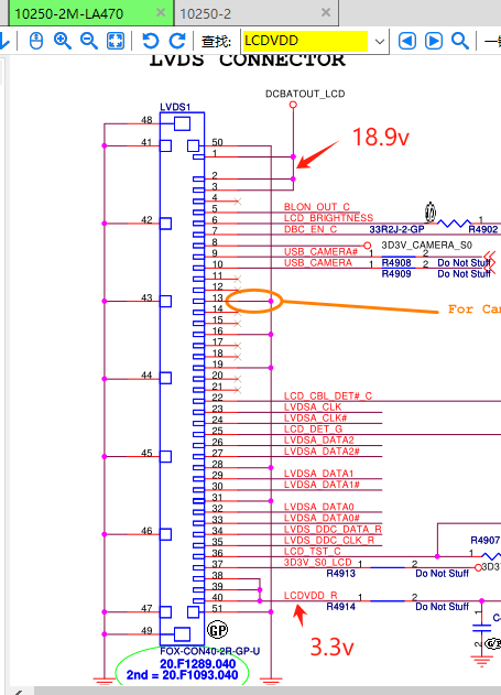 找到LVDS1座子,检查DCBATOUT_LCD=18.9v、LCDVDD=3.3v、BLON_OUT_C=3.3v开启信号、LCD_BRIGHTNESS=3.3v电压范围。