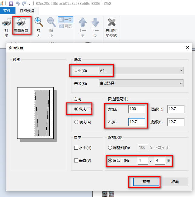 3、先 页面设置中 设置 打印A4 纸,纵向 ,分两栏就要把右边距设置为100,在适合于 设置 1 x 4,这里适合于根据左图缩略图看效果,然后确定,最关键是在打印时设置为只打印 奇数页;