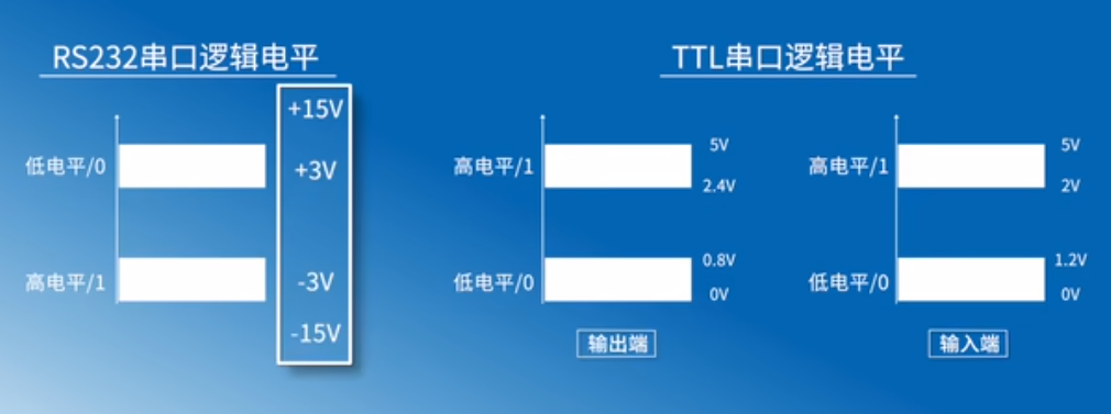 RS232:全双工模式,可以长达15米以内通讯,低电平/0:+3v至+15v,高电平/1:-15v至-3v;