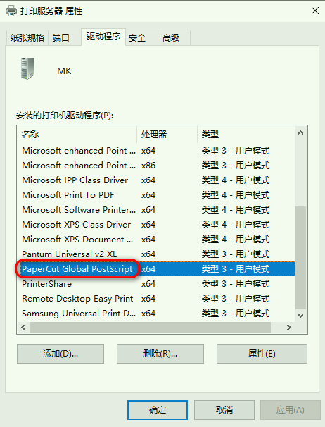 驱动名称:PaperCut Global PostScript