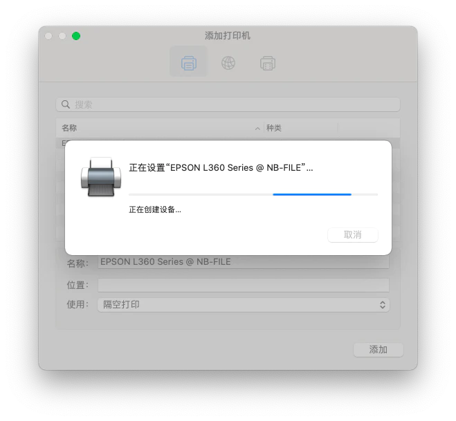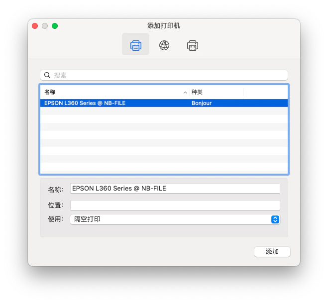 在「添加打印机」中选择第一个选项卡,不出意外的话环境会自动搜索到上面设置好的 AirPrint 打印机,选择并点击添加即可。