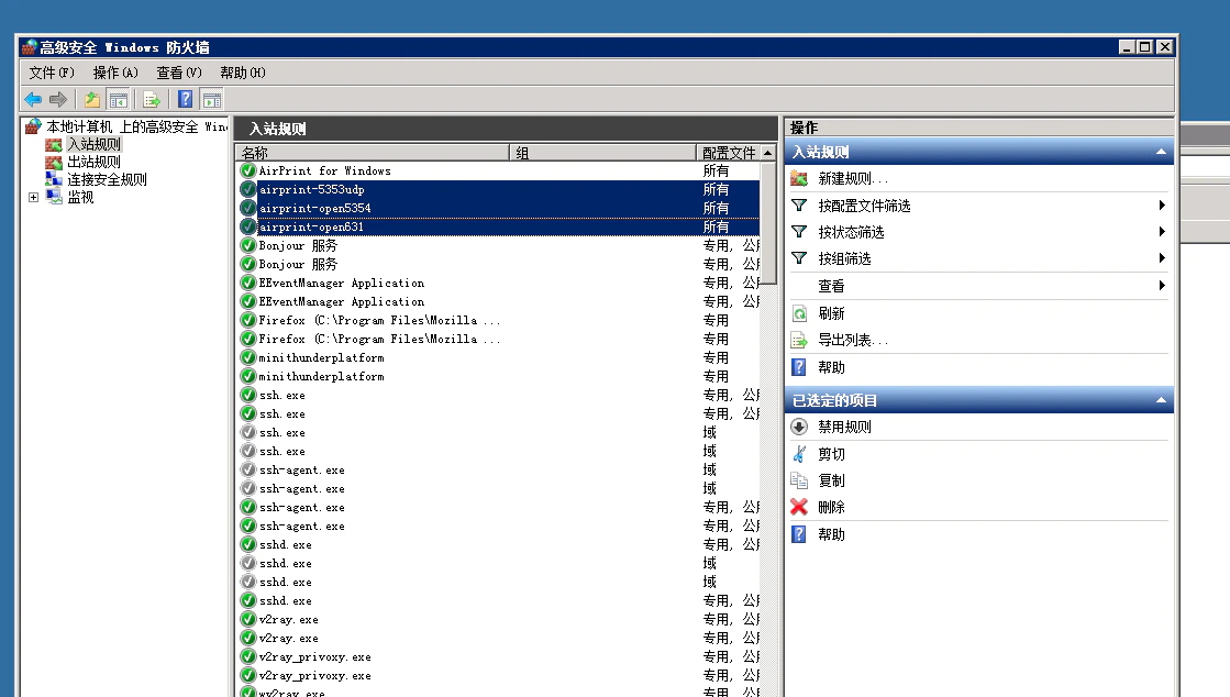 同样的办法我们需要设置三条规则,除了上面的 TCP 5354 端口之外,还需要放行 UDP 5353 端口以及 TCP 631 端口,这样防火墙方面算是全部设定完毕了。