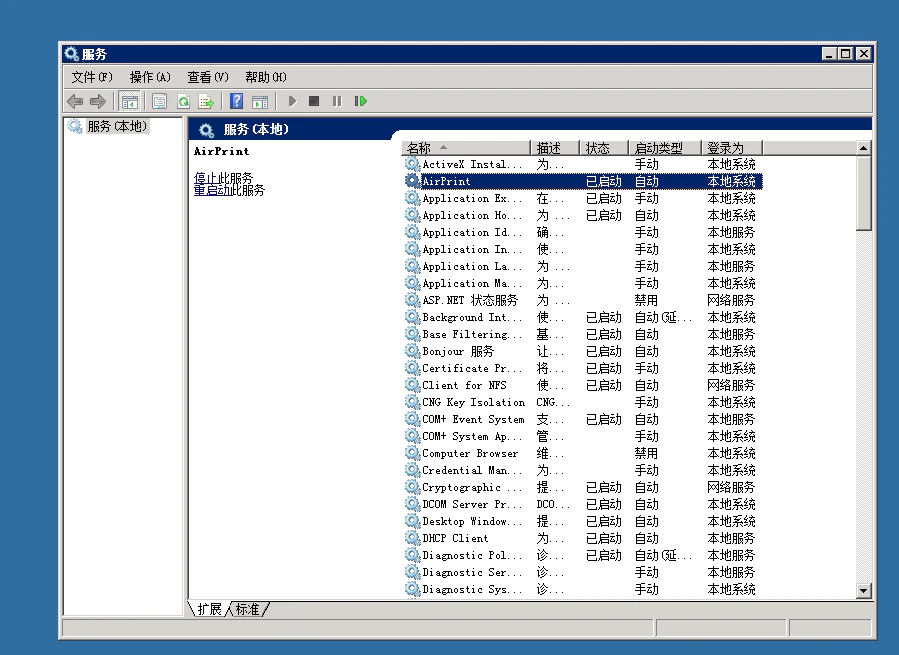 然后我们打开「控制面板 > 管理工具 > 服务」,检查 AirPrint 以及 Bonjour服务 两个服务是否已经处于启动状态。