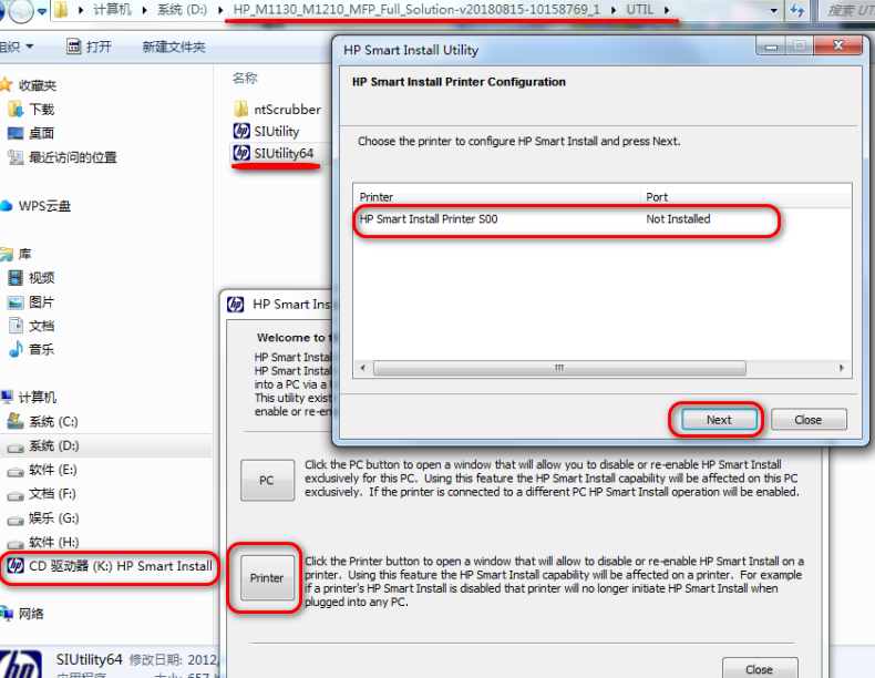 1、在HP智能安装驱动器或者下载的安装包解压后找到UTIL\SIUtility64.exe 文件打开,选择打印机后点击Next;